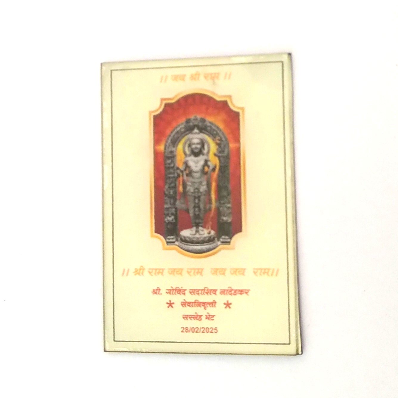 The uploaded artwork includes printed text such as mantras, the devotee’s name, and an event date—showing how an Acrylic Photo Frame can be customized for: