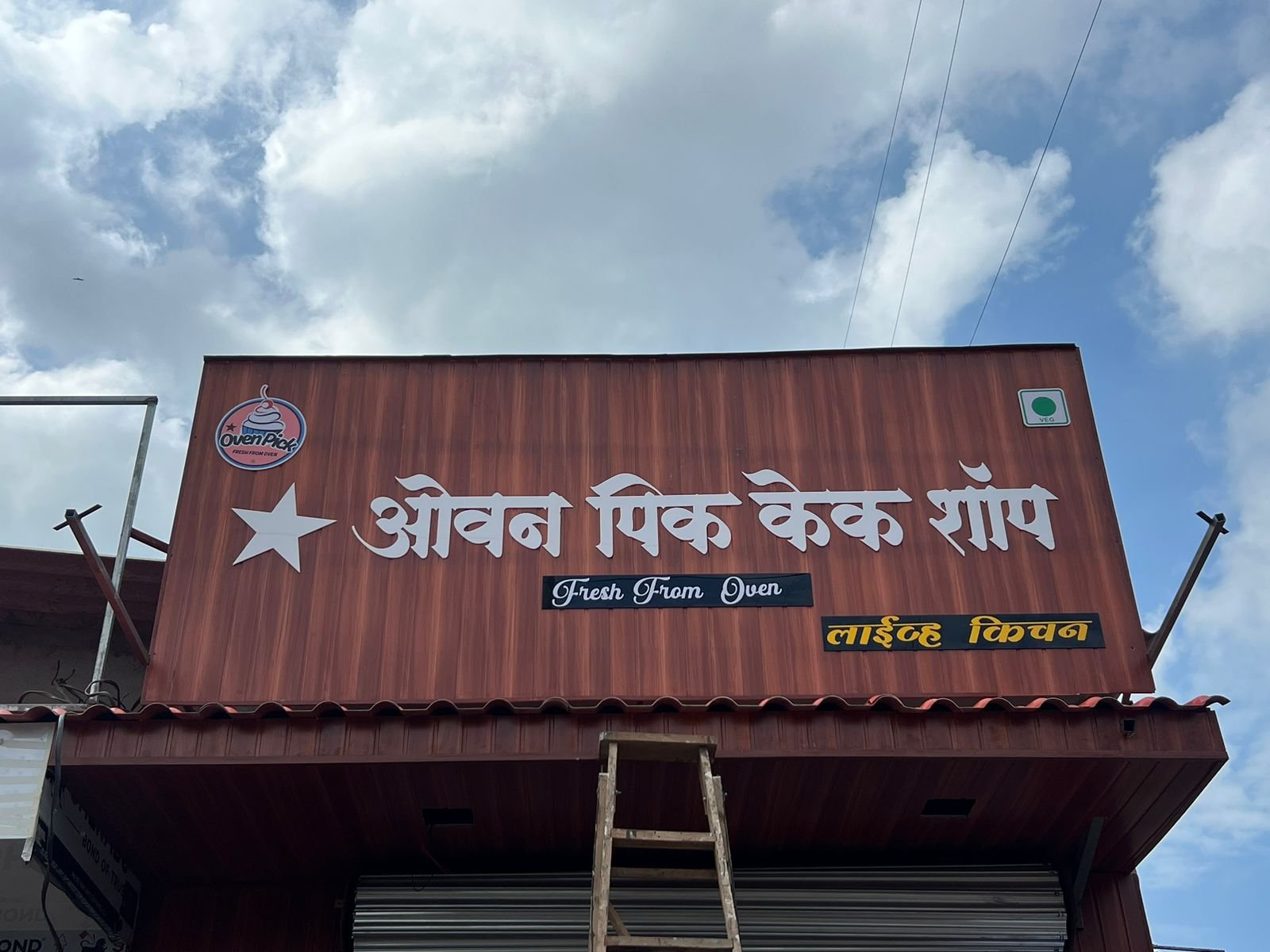 This bakery signage board has a clean and elegant layout that focuses on clarity and visual impact. The wooden-textured background gives the storefront a warm and inviting look, while the bold white Marathi lettering ensures excellent readability from a distance. The bakery icon on the top-left corner adds quick recognition, and the “Fresh From Oven” label communicates freshness and quality. These design elements work together to create a strong identity that makes the bakery instantly memorable and trustworthy.