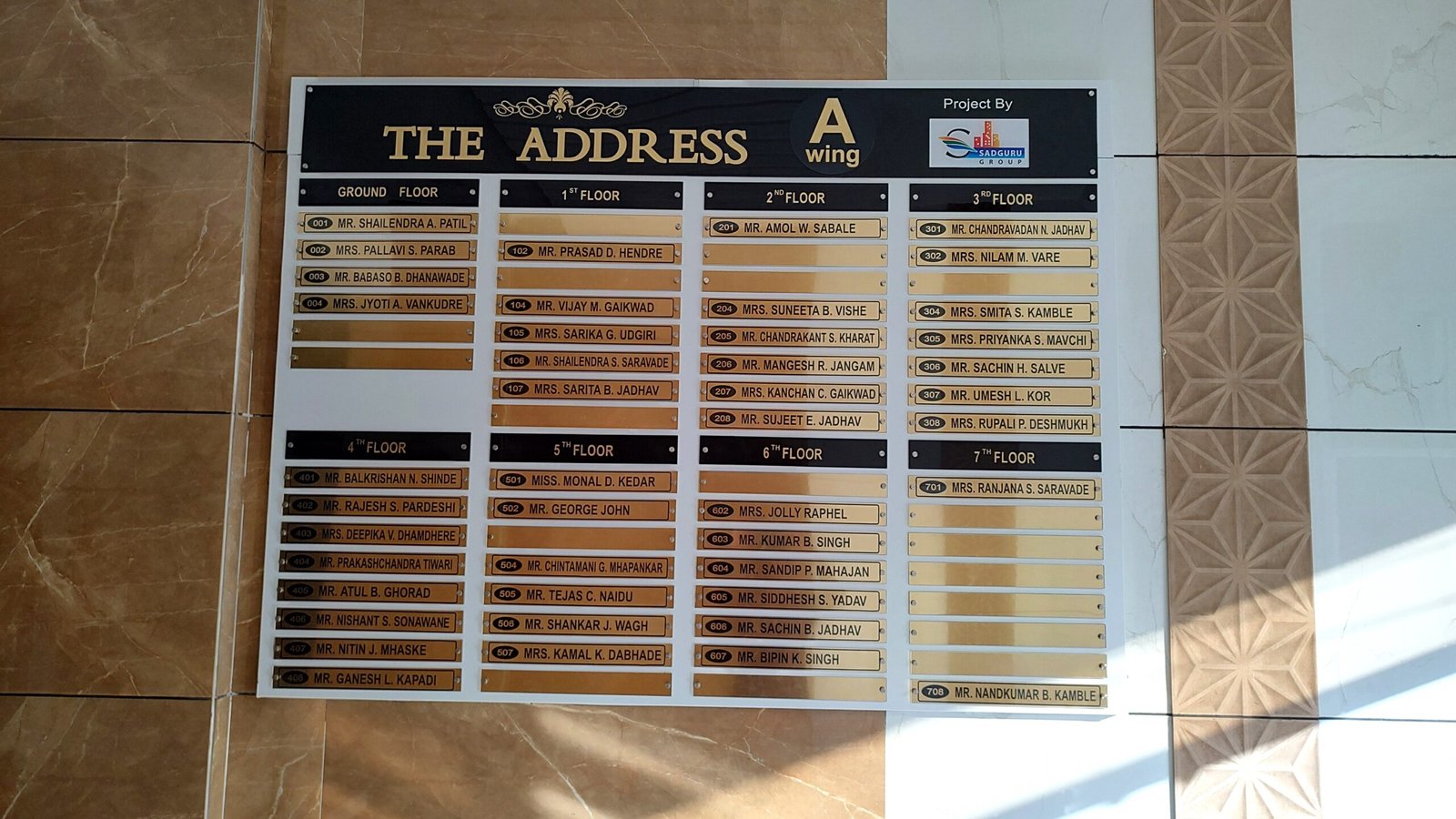 This housing society name board is designed for indoor lobby installation. Its smooth surfaces are dust-resistant and easy to clean. The modular design also means that if the society decides to renumber flats or change the floor designations later, the headers can be easily swapped out.