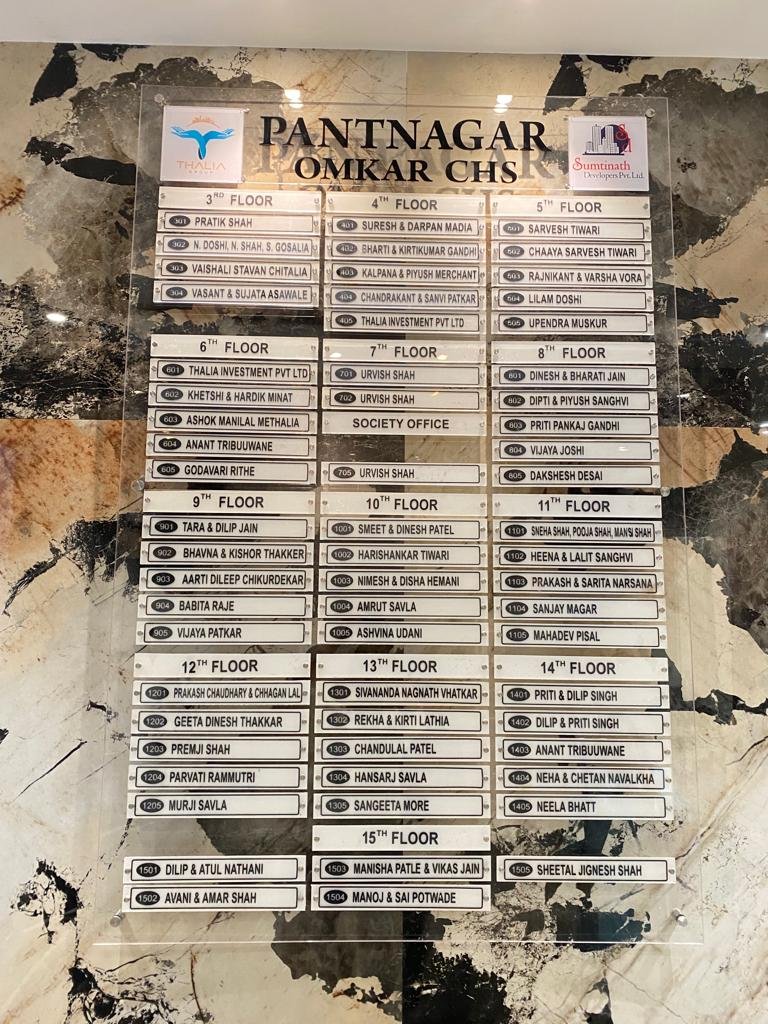 Modular Updates: High-rise buildings see frequent tenant turnover. This housing society name board is designed so that individual names can be scraped and re-applied, or printed on thin clear strips, allowing for easy updates without removing the main unit.