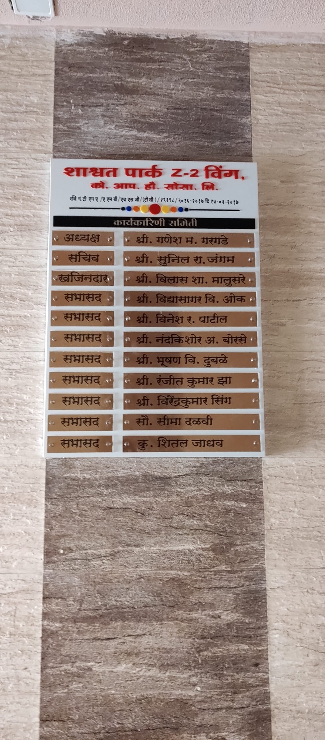 While a standard housing society name board lists all residents, this specialized unit focuses on leadership. It serves as the official “Who’s Who” of the building, ensuring that every member knows exactly whom to contact for administrative issues, from the Chairman (Adhyaksh) to the Treasurer (Khajindar).